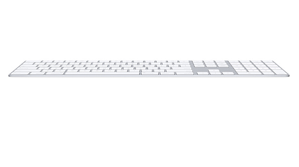 Magic Keyboard with Numeric Keypad features an extended layout, with document navigation controls for quick scrolling and full-size arrow keys for gaming. A scissor mechanism beneath each key allows for increased stability, while optimized key travel and a low profile provide a comfortable and precise typing experience. The numeric keypad is also great for spreadsheets and finance applications. And the built-in, rechargeable battery is incredibly long-lasting, powering your keyboard for about a month or more between charges.