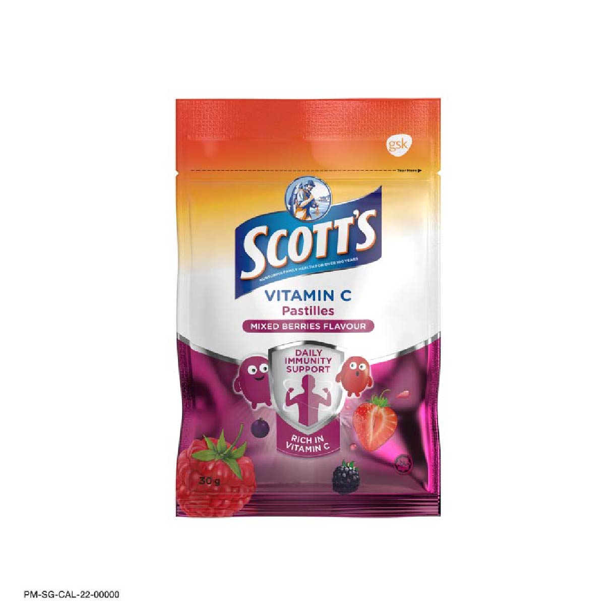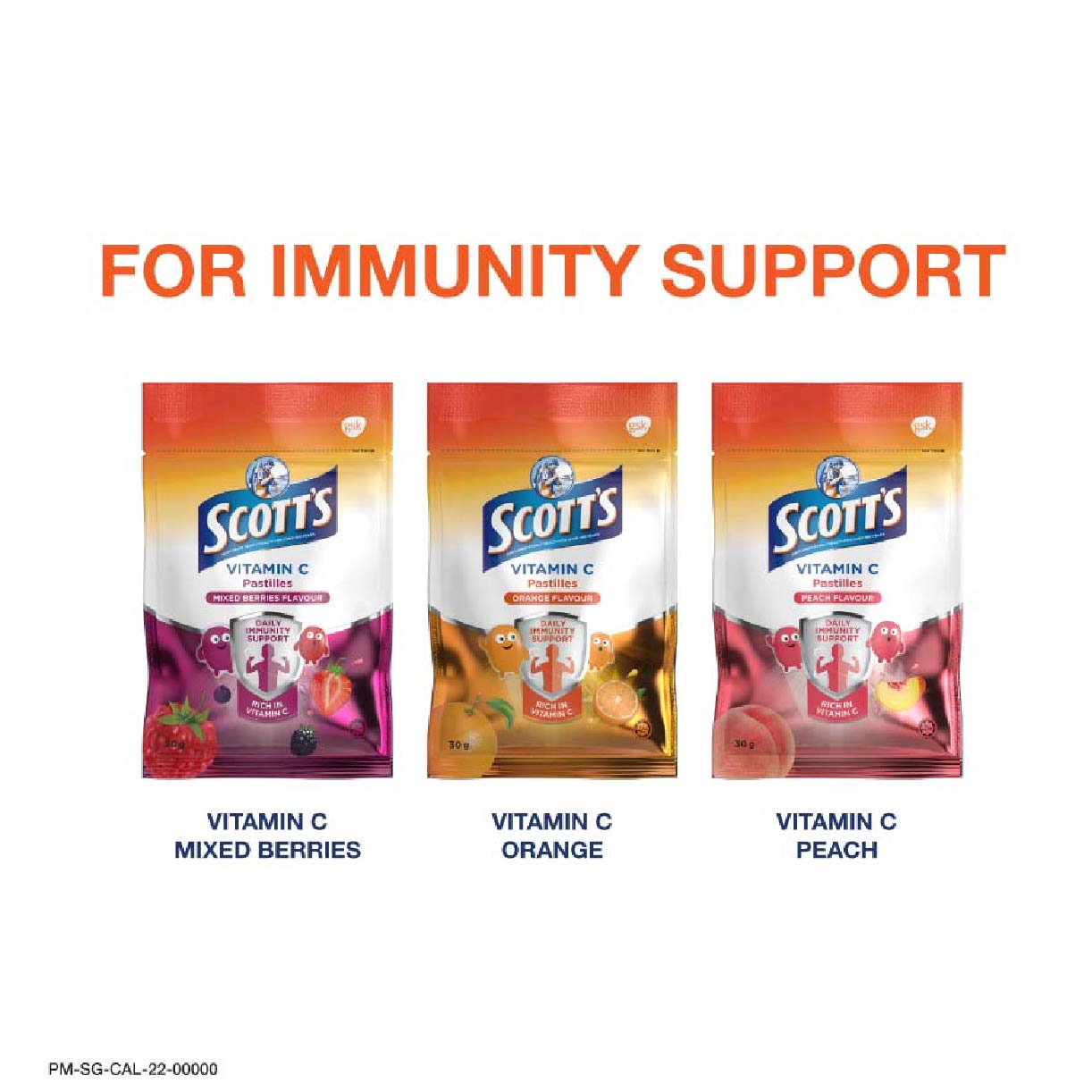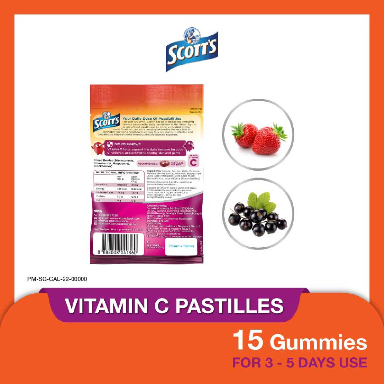 One Scott’s Vitamin C pastille helps provide 21 mg of Vitamin C Scott’s Vitamin C Pastilles are available in mixed berries, orange, peach and mango flavours – every child has a favourite flavour! (MAHS:MAHS09003500