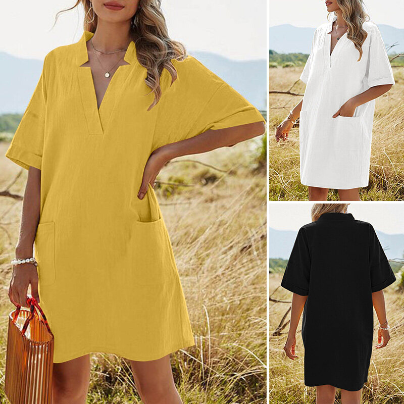 ZANZEA Womens Summer Half Sleeve V Neck Cotton Sundress Casual Loose Solid Mini Dress