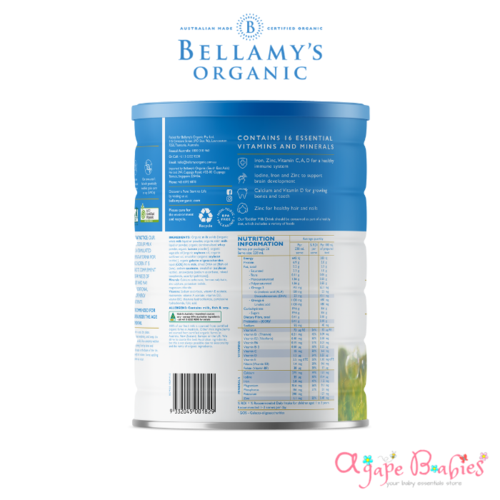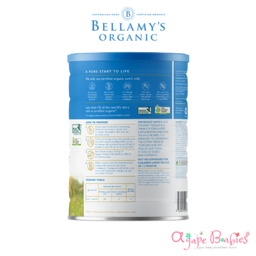 With Bellamy’s, you can be sure that our specially selected certified organic ingredients have been grown without synthetic fertilisers, pesticides and growth hormones.You may notice that the new formula will look slightly different to the old formula when dry, simply because the new recipe has a higher content of organic whole milk powder.