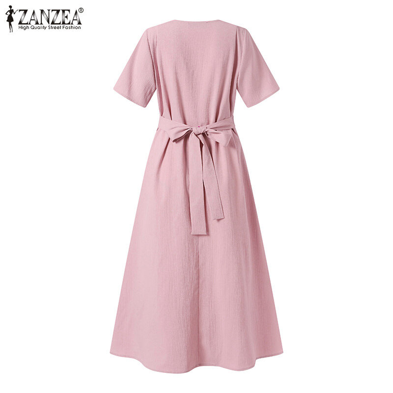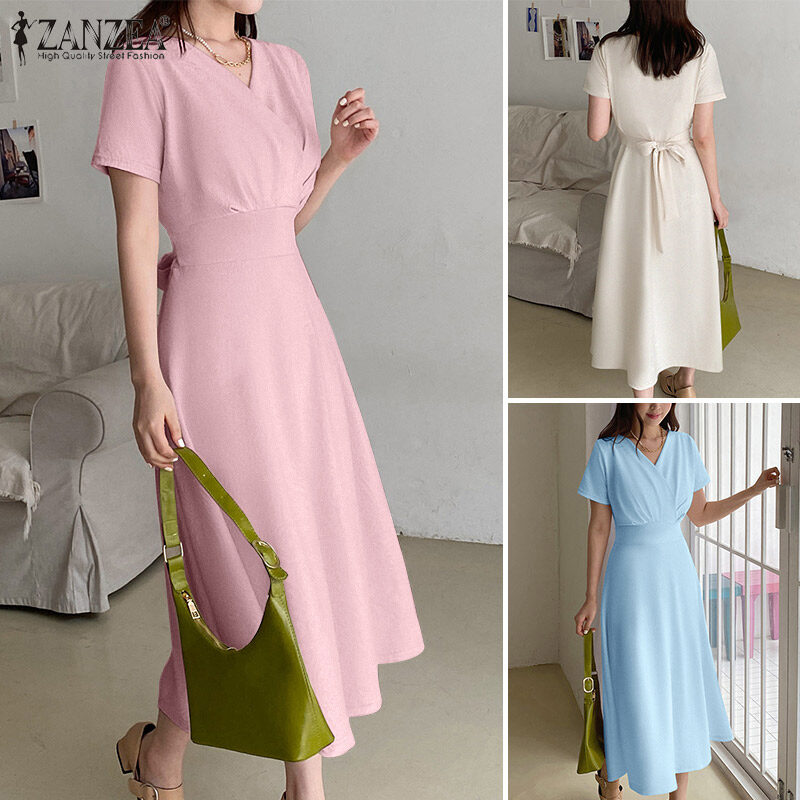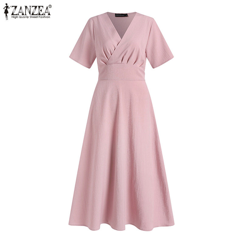ZANZEA Korean Style Women Elegant Plain V Neck Tunic Dress Short Sleeve OL Midi Dresses #10