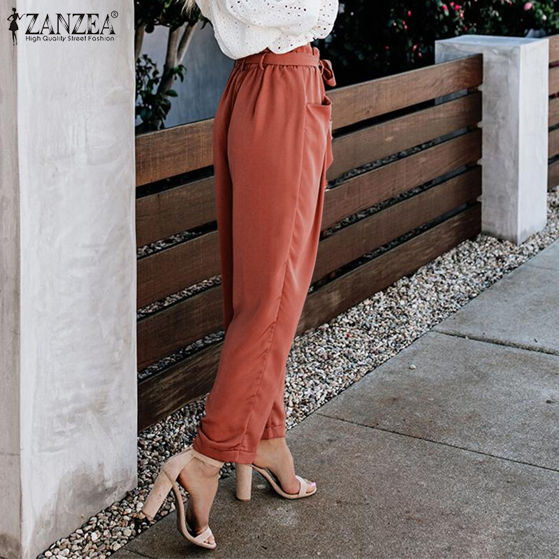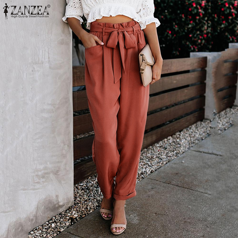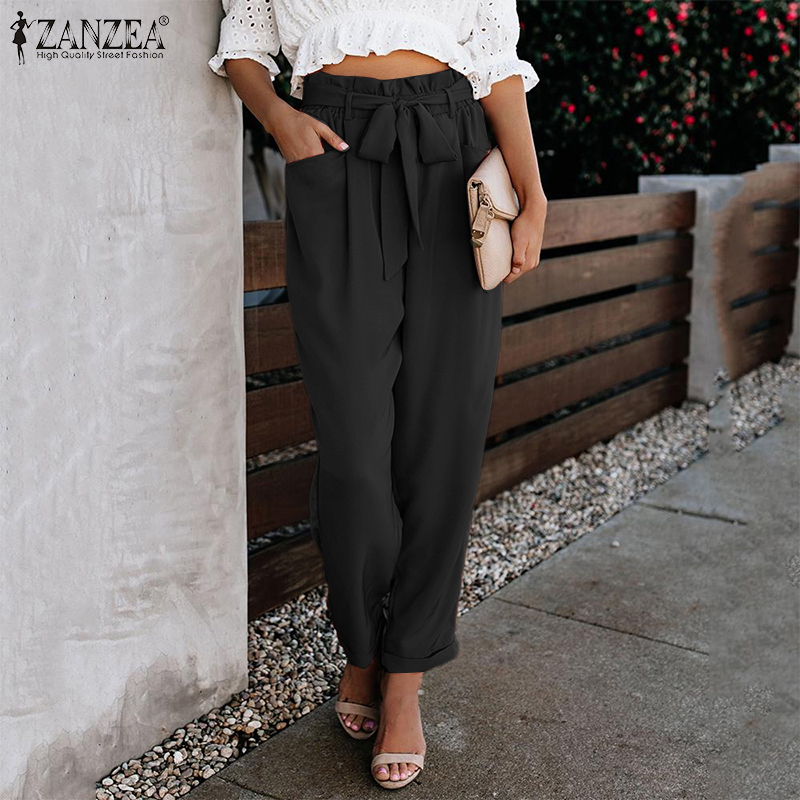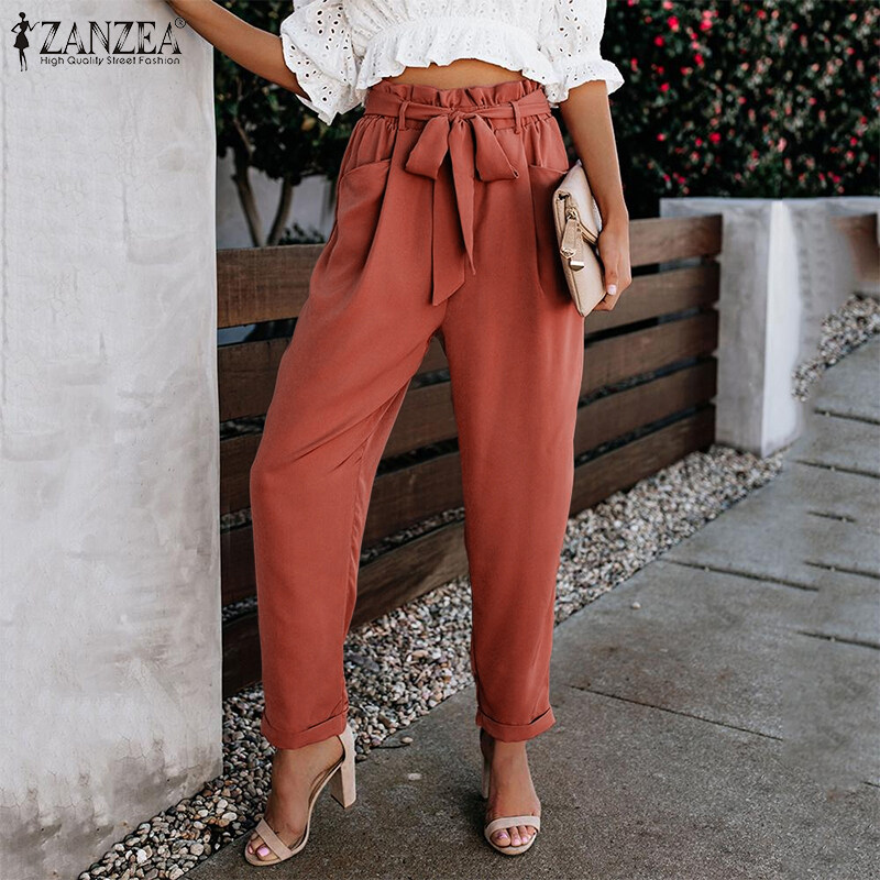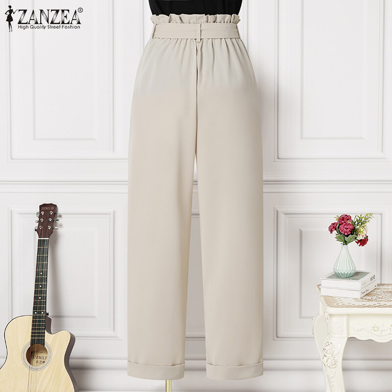 ZANZEA Women Ruffle Trim High Waist Pants Elastic Waist Fashion Commuted Straight Pants #15