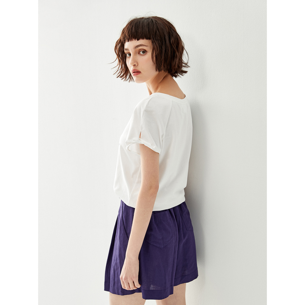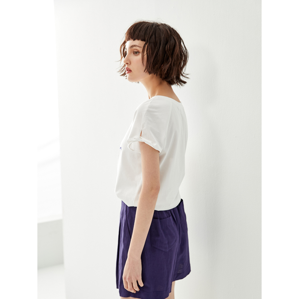 •V-neckline •Front graphic print •Short sleeves with side knot detail
