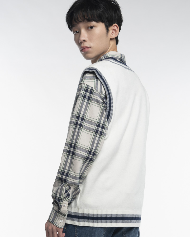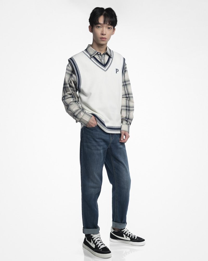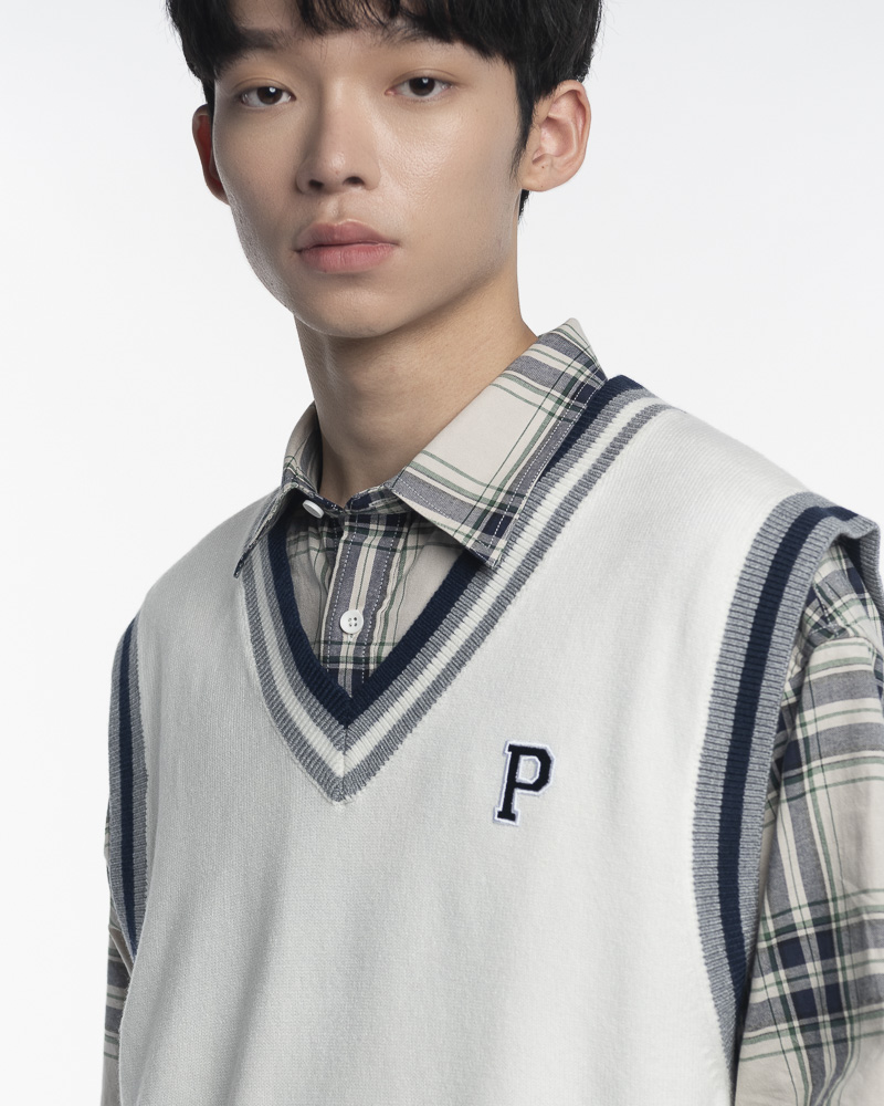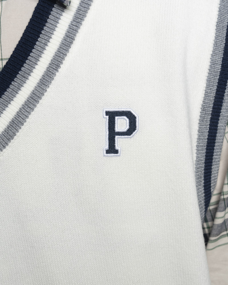 Yishion Men Knitted V Neck Varsity Vest With Asymmetrical Contrast Coloured Neckline and P Embroidery (White)