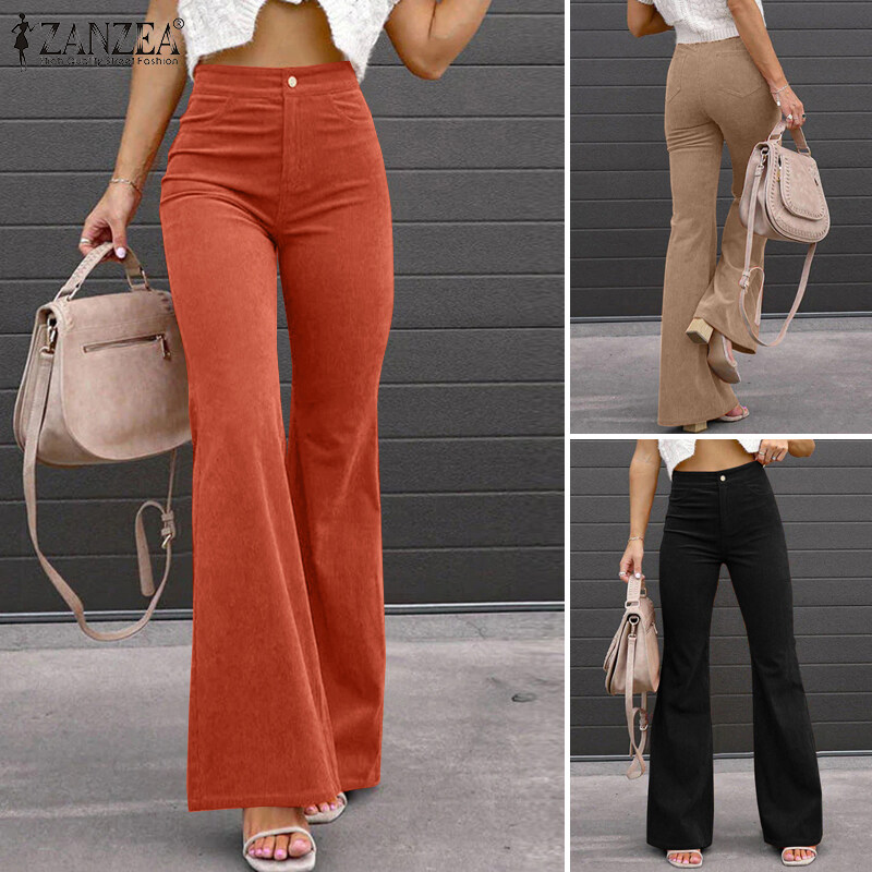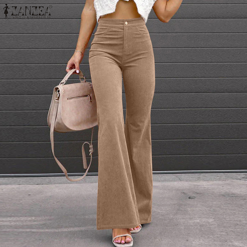 ZANZEA Women Formal Office Corduroy Flare Pants Business Leisure High Waist Solid Trousers #15