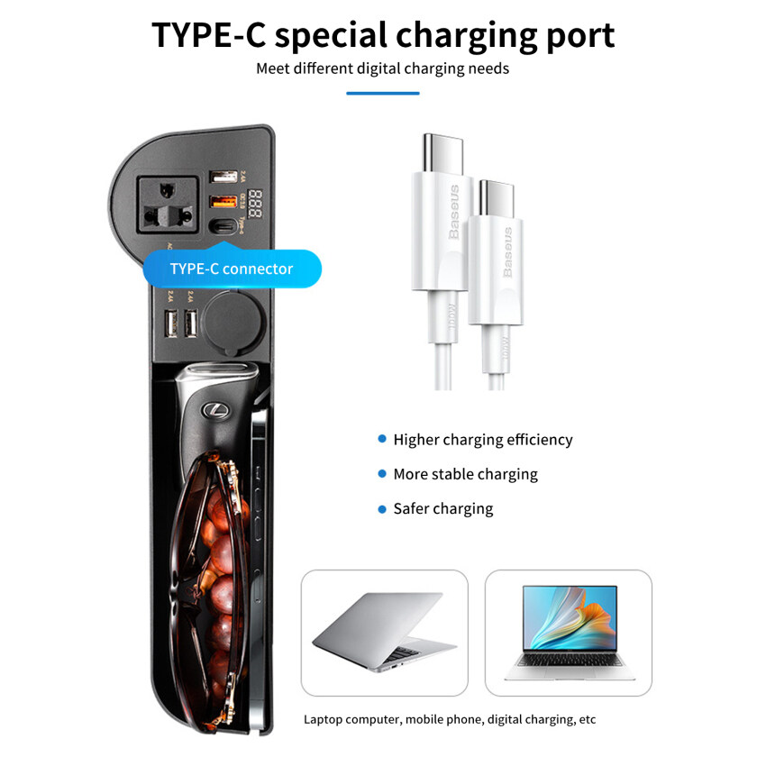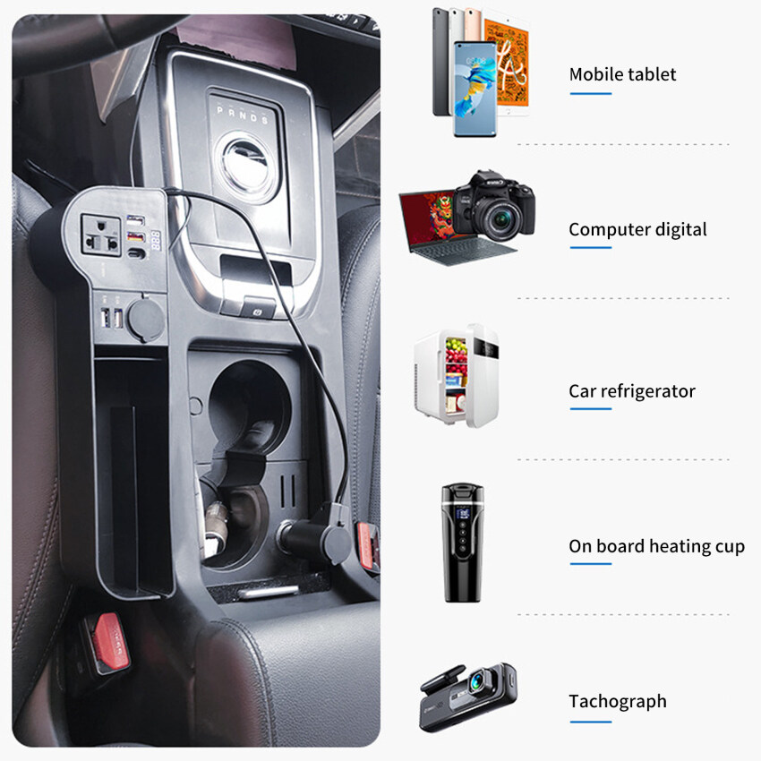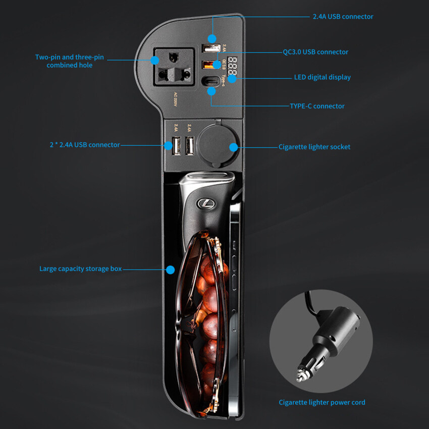 2. Suitable for 12V/24V cars, with multiple types of charging ports, including 3*2.4A USB ports, 1*QC3.0 fast charging USB port, 1*Type-C port, and 1*220V plug (compatible with European regulations, US Regulations and Australian regulations), 1*cigarette lighter interface.