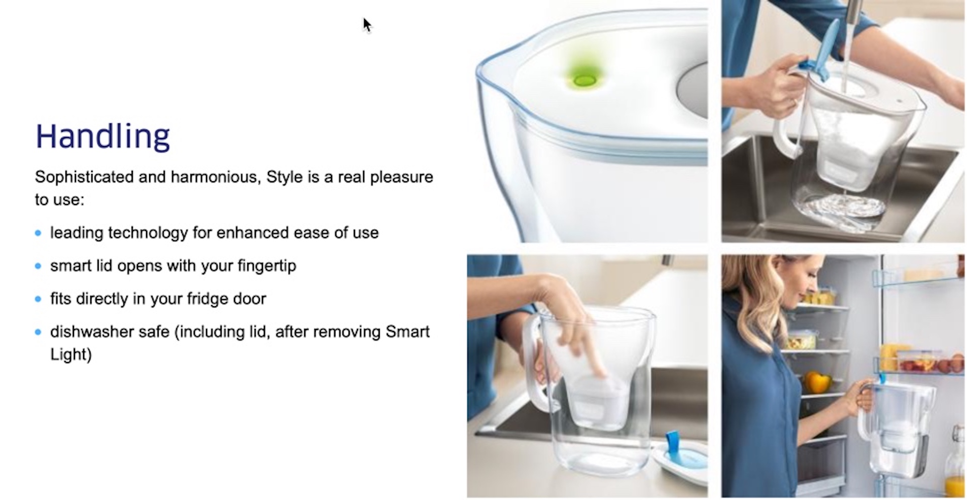 Maxtra+ MicroFlow Technology for great tasting water.Modern, soft shape jug designFlip-top lid withsilicone strap for easy refillingInnovative BRITA Smart Light uses a traffic light system to signal when it's time to replace the cartridgeDesigned to fit in your fridge door
